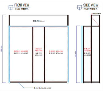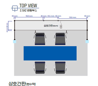 상호 간판 : 행사로고, 참가기업명 (국영문) 가구 : 상담용 테이블 1개, 상담용 의자 4개 조명, 바닥 파이텍스 ※ 전기 및 인터넷 사용시 별도 신청 필요 |